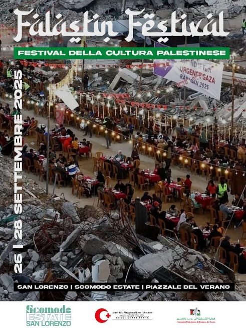 Dal 26 al 28 settembre, il festival ufficiale della Palestina sbarca al San Lorenzo festival con ospiti come l’Ambasciatrice Palestinese in Italia, Edoardo purgatori attore, Chiara Baschetti attrice e top model, Marisa Laurito, Anna foglietta, Sabina Guzzanti, Andrea Arcangeli attore, Paola Turci, Ludovica Jona giornalista, Enzo iacchetti, Luigi De Magistris, Lorenzo Lombardi Dallamano divulgatore online/Influencer.